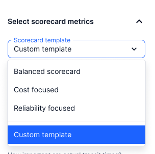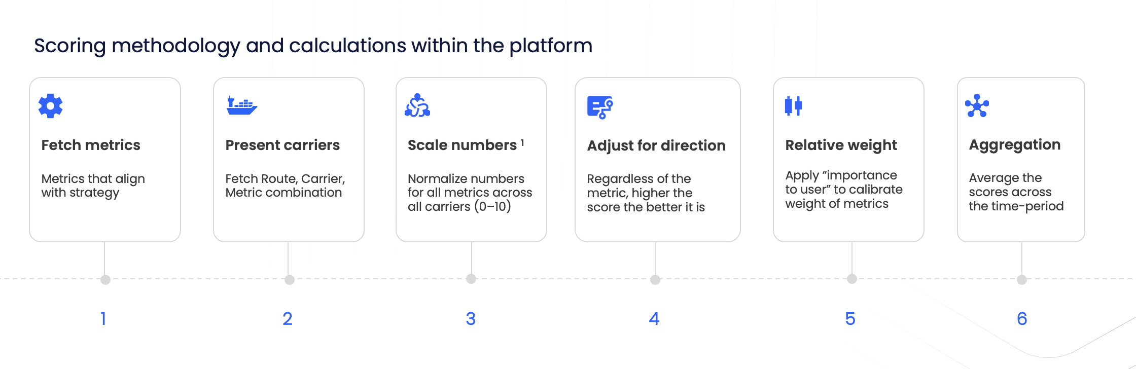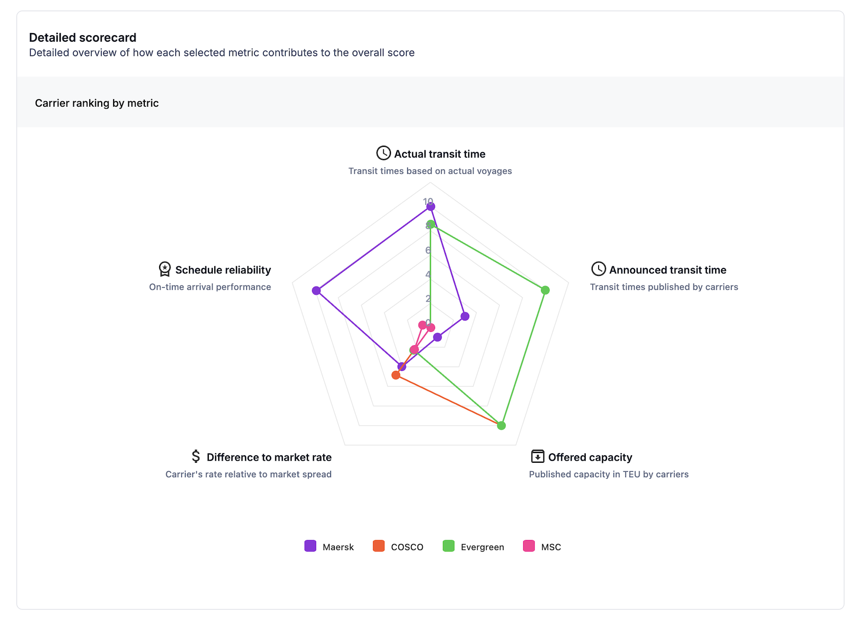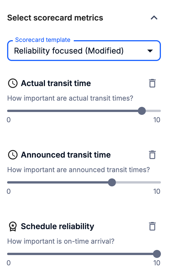 Each metric you add (like schedule reliability, transit time, or difference to market rates) is converted into a score from 0 to 100, but is not visible to the user.