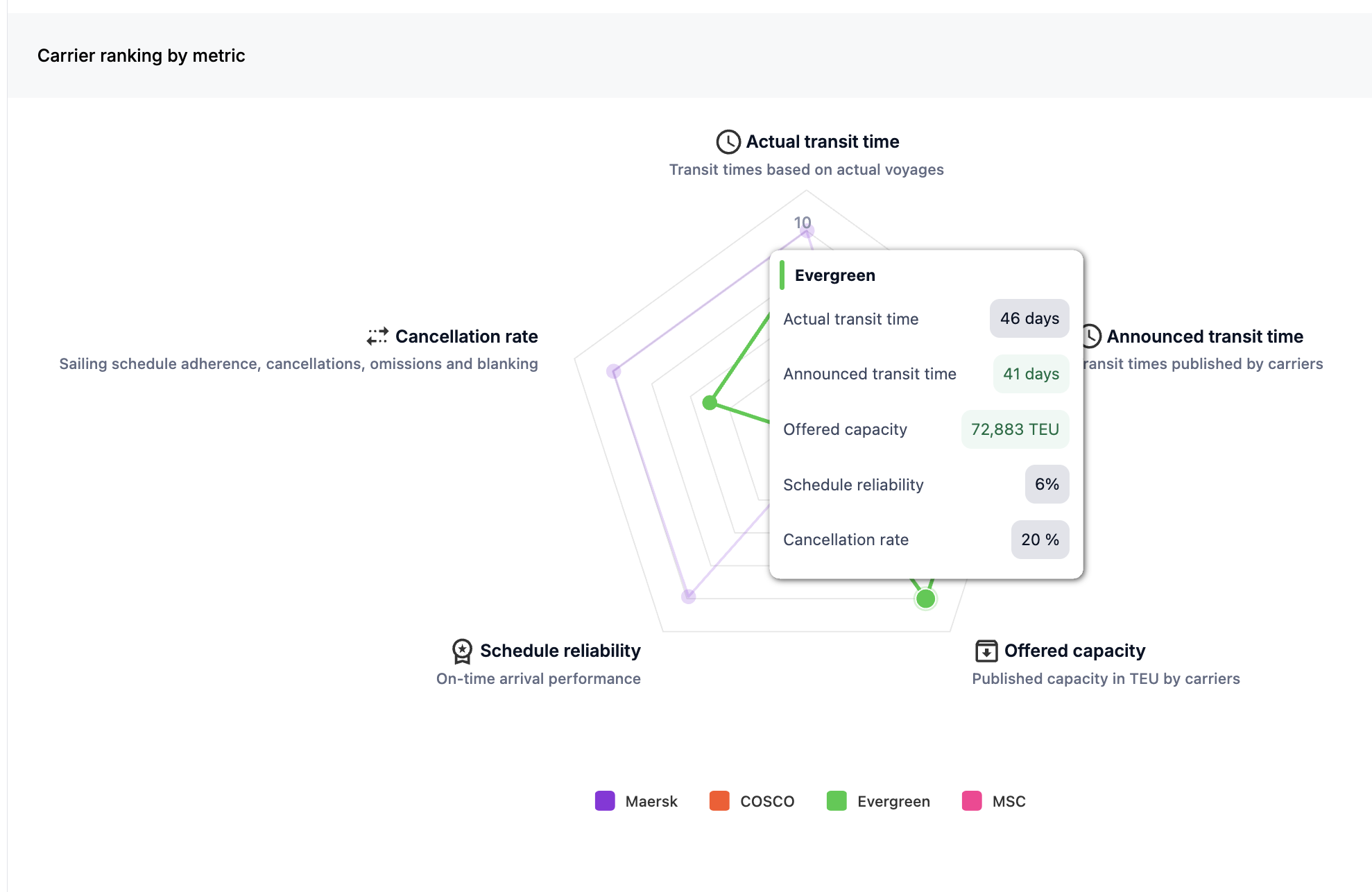 - Core metrics: including transit times, schedule reliability, capacity offered, capacity blanked, carbon emissions index (CEI)