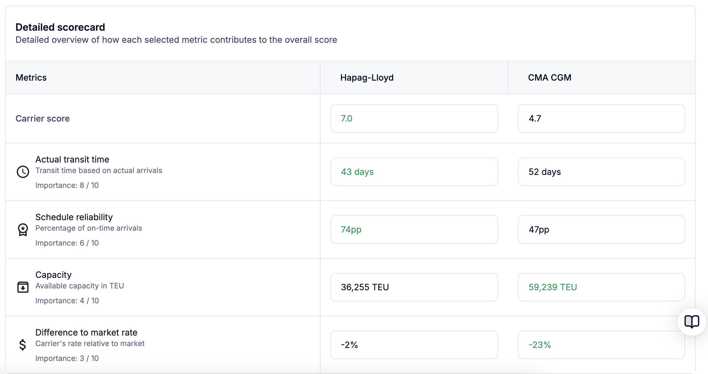 - Derived metrics: including difference to market, transit time deviation, cancellation rates
