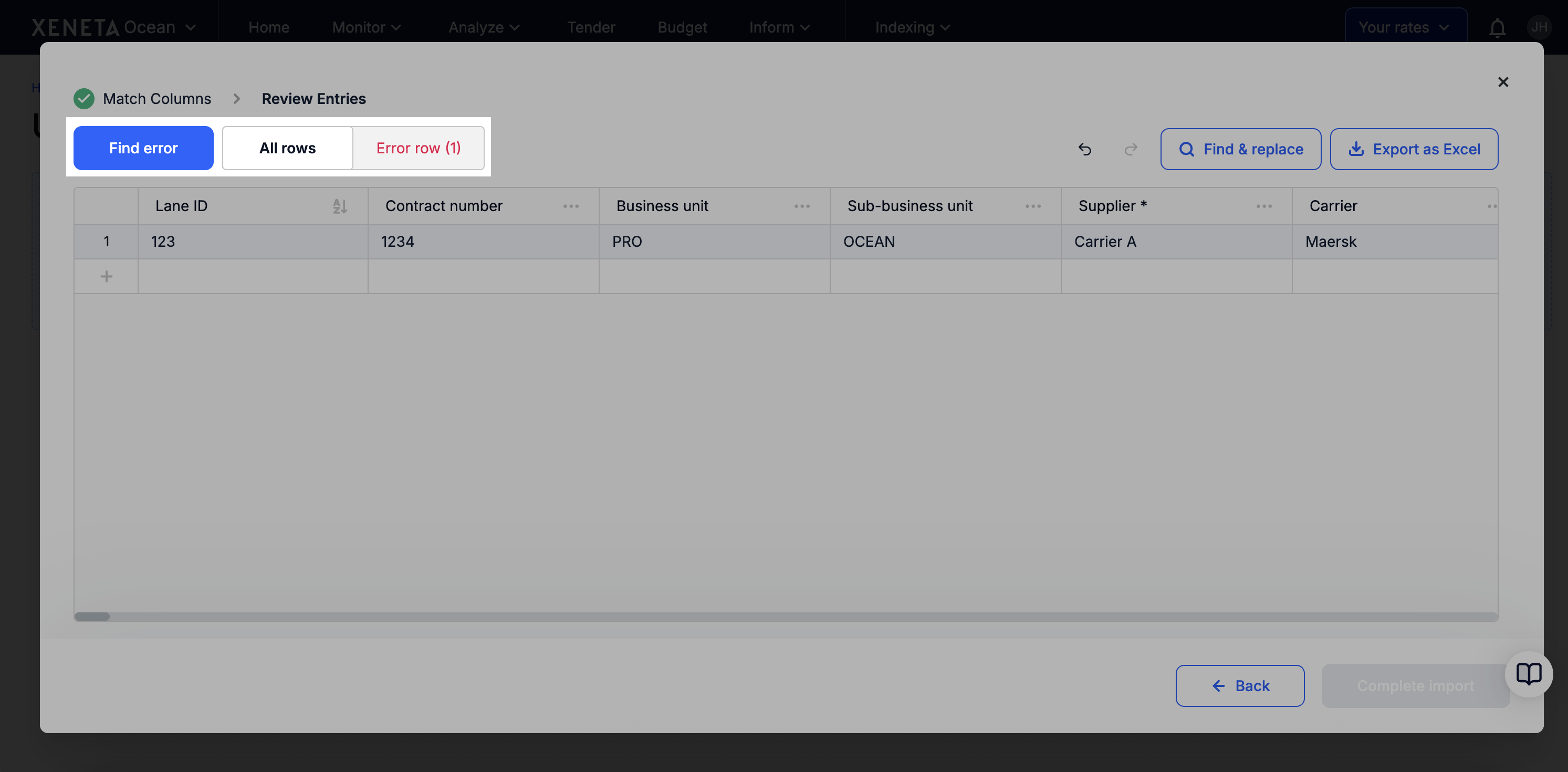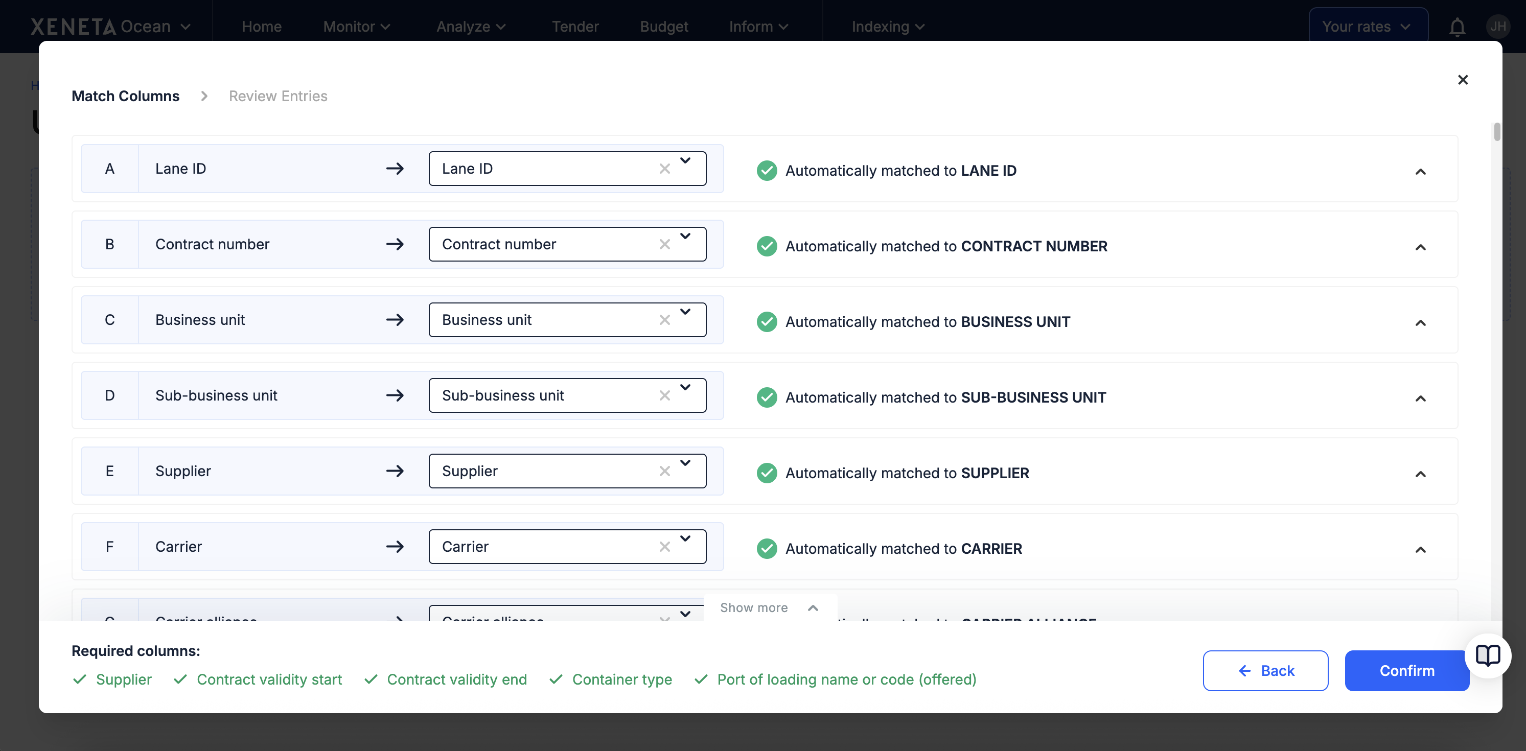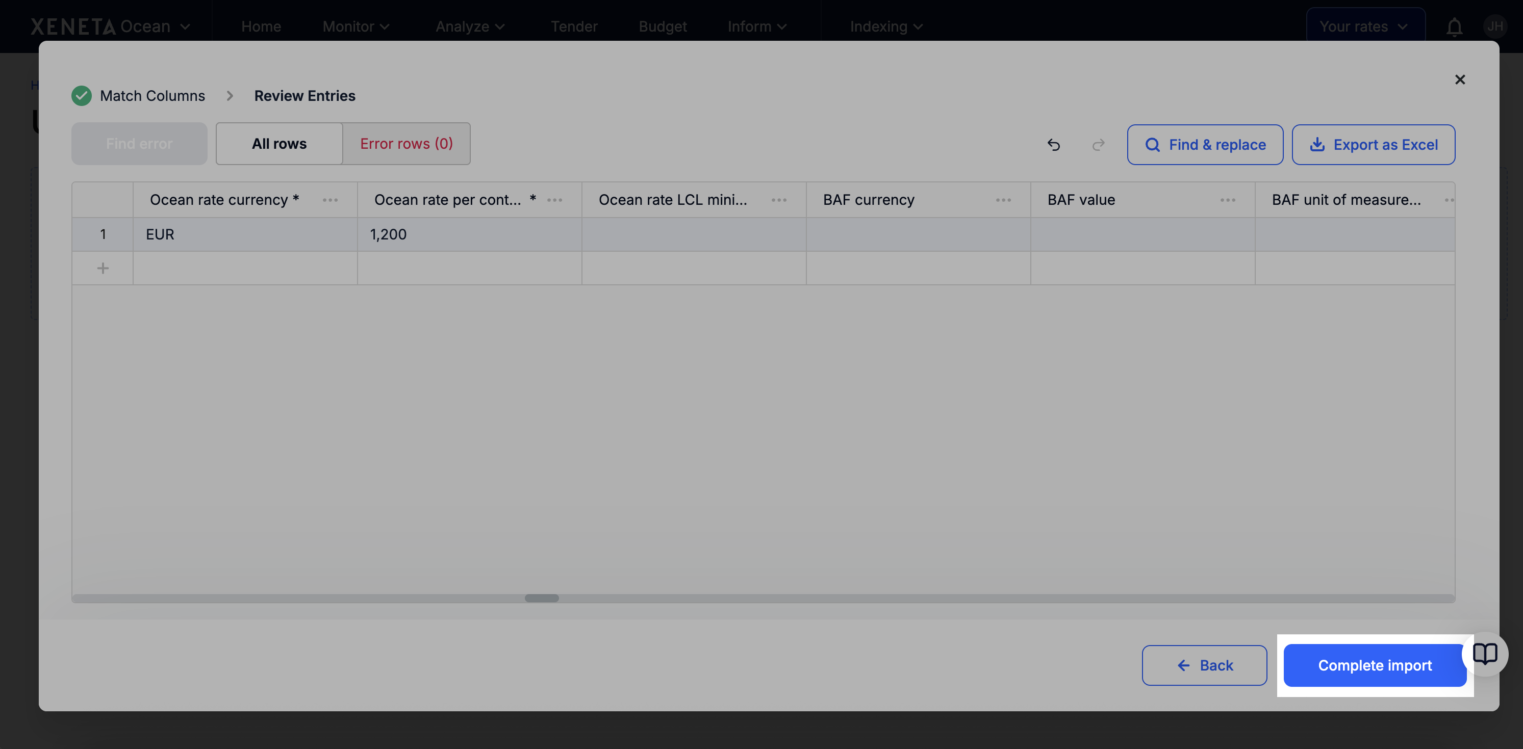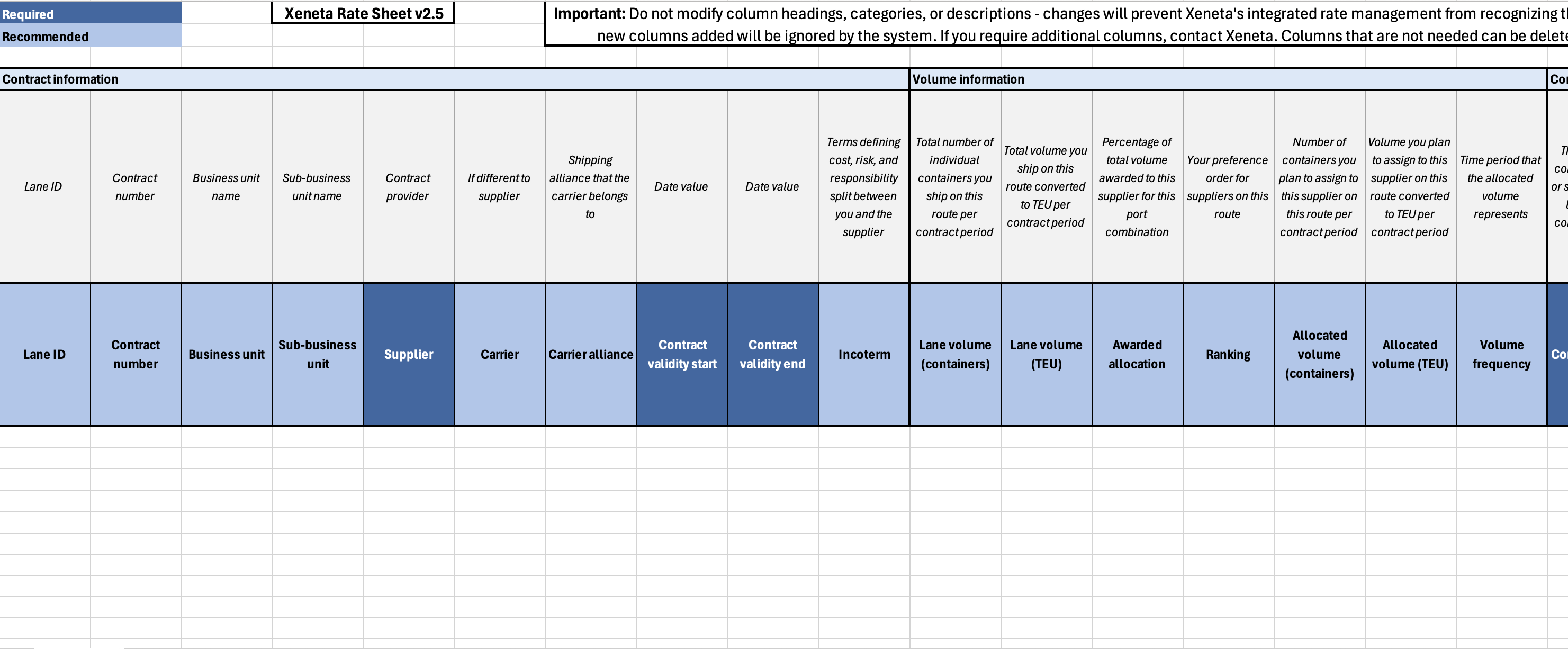 Xeneta’s Integrated Rate Management is designed to work flexibly with your data, so any empty columns will be ignored. Simply only populate the fields that are relevant to you, and the system will handle the rest.