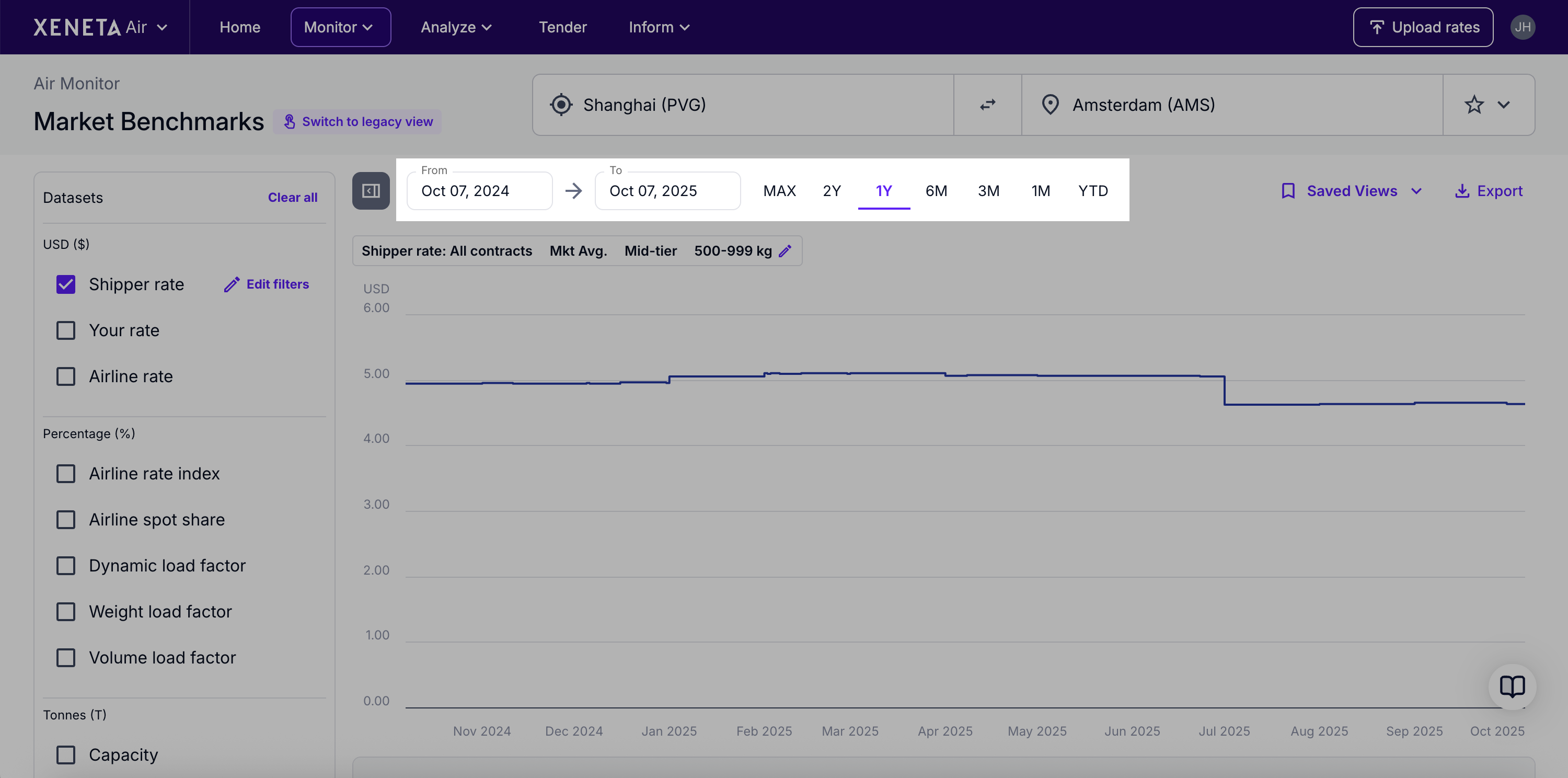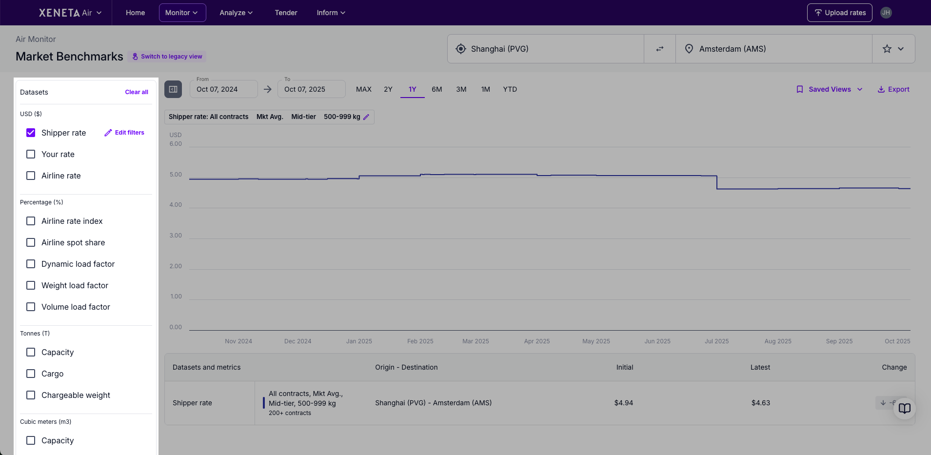 All of Xeneta Air's datasets are listed in the panel (left). Check and uncheck a box to show or hide that dataset on the graph (right).