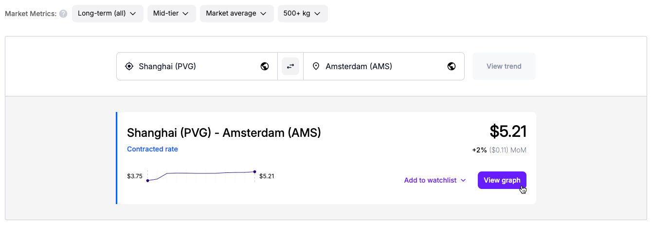 In Market Overview, search for a trade lane that you want to explore historical rates on, then click on View trend. This opens up a small graph (seen in the image below). To review the trade lane on Market Benchmarks click on View graph.