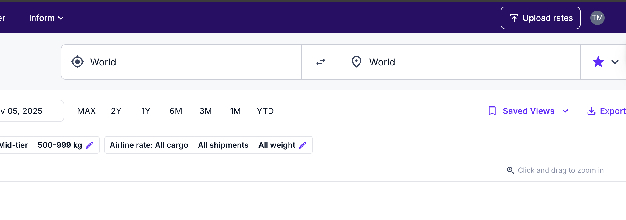 You can type "World" as the origin or destination on the Market Overview, Air Monitor: Market Benchmarks, and Trade Lane Graph screens. By selecting "World" in both the origin and destination fields, you will see the average rates and total volume/capacity across all trade lanes. You can also use "World" to see the average rates and total volume/capacity for all lanes into or out of a specific location.