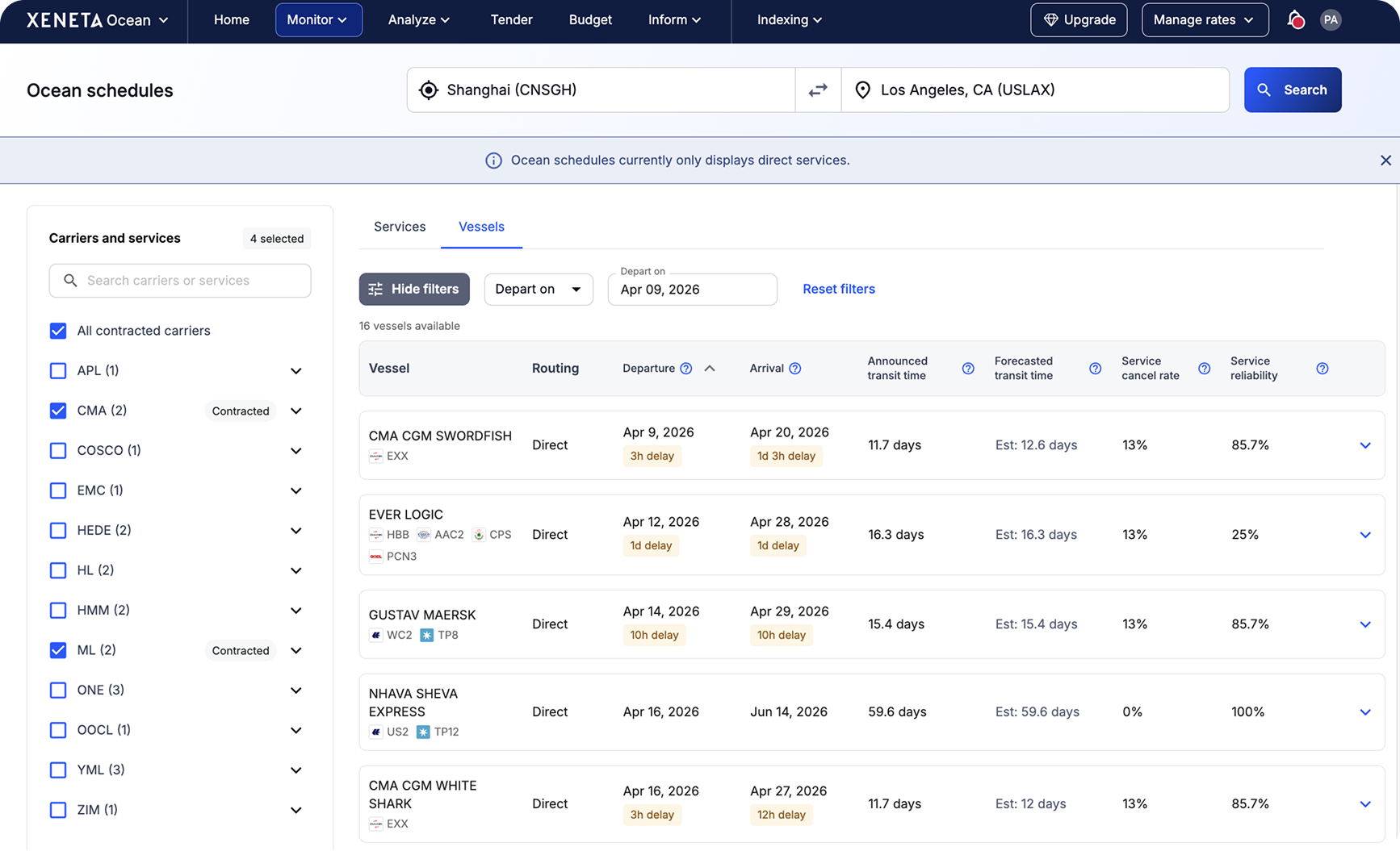 Ocean Schedules shows you how ocean services and vessels are actually performing across all major carriers. Search by port pair to see how a service has been doing — how reliably it arrives on time, how long voyages are typically taking, and how often sailings get cancelled.