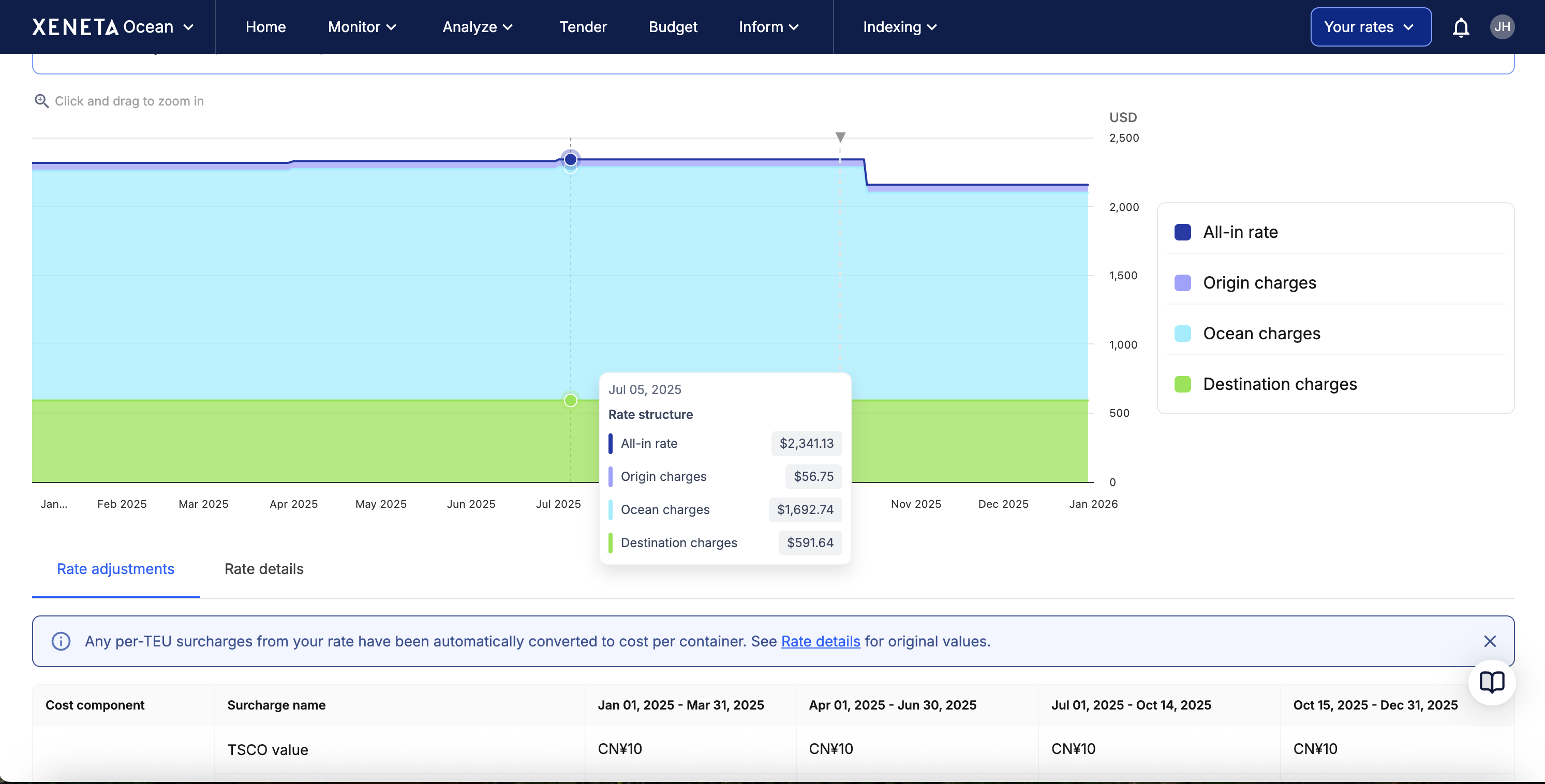 The Rate Adjustment Graph shows how your freight charges have changed over the course of a contract. While the snapshot view above provides today’s totals on a rate, the graph highlights how your origin, ocean, and destination charges have increased or decreased over time.