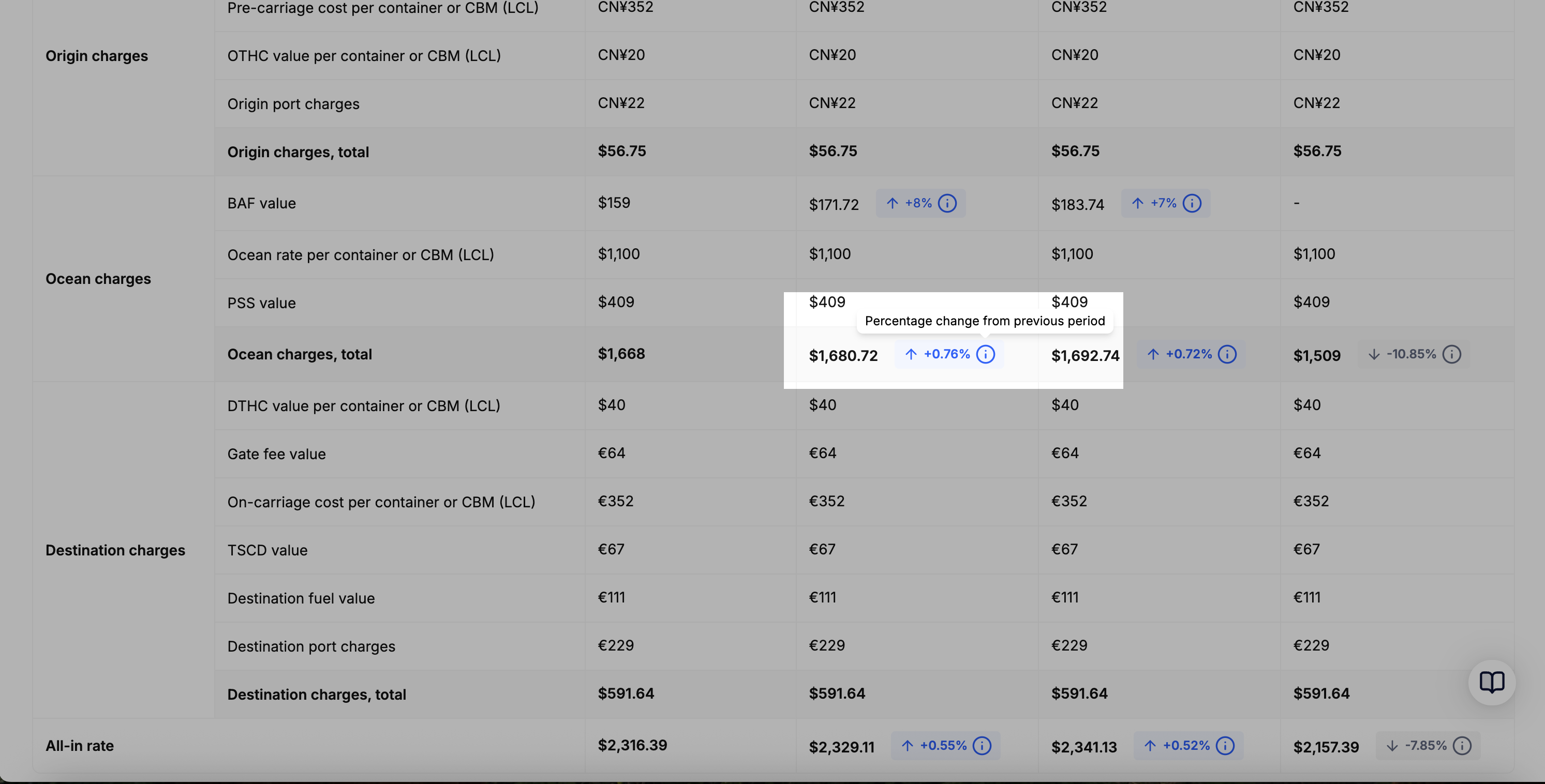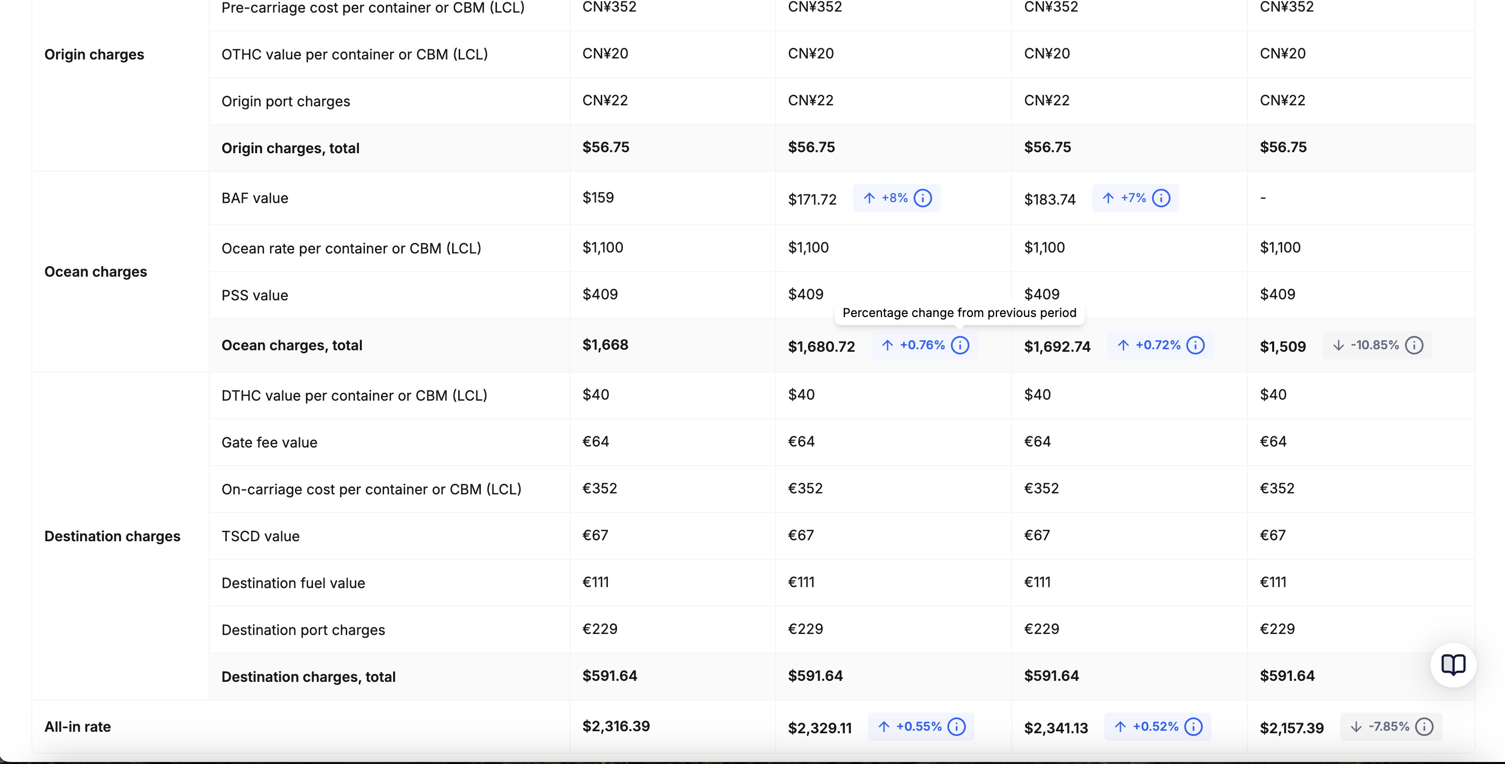 For certain charges, such as the peak season surcharge, the table also includes change indicators (e.g., -5% or +5%). These quick visual cues show whether your current rate is lower or higher than what you’ve previously paid — making it easy to spot where costs have risen or dropped.