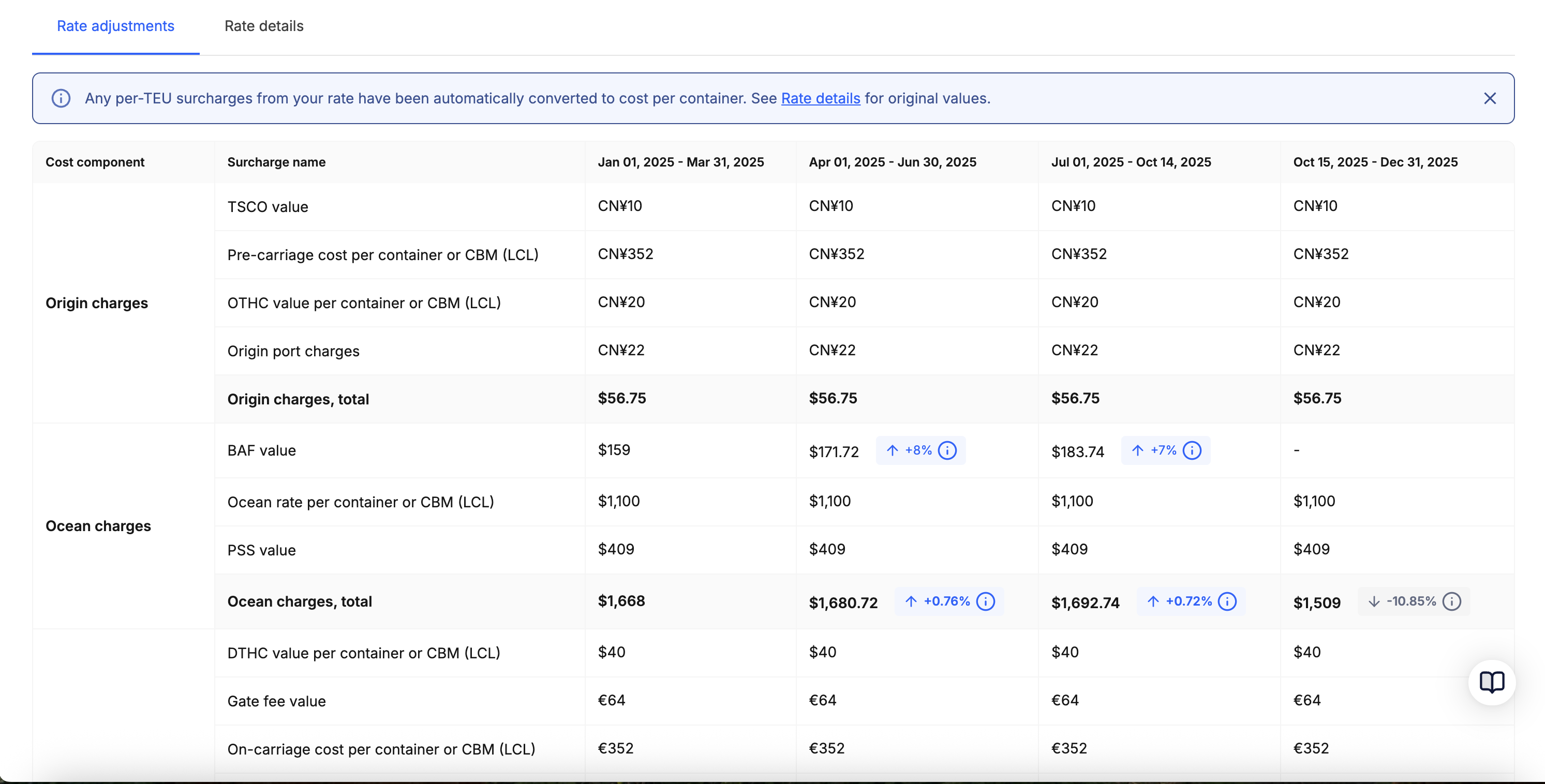 The Rate Adjustment Table gives you a detailed, line-by-line breakdown of every cost component that makes up your freight rates – covering origin, ocean, and destination charges.