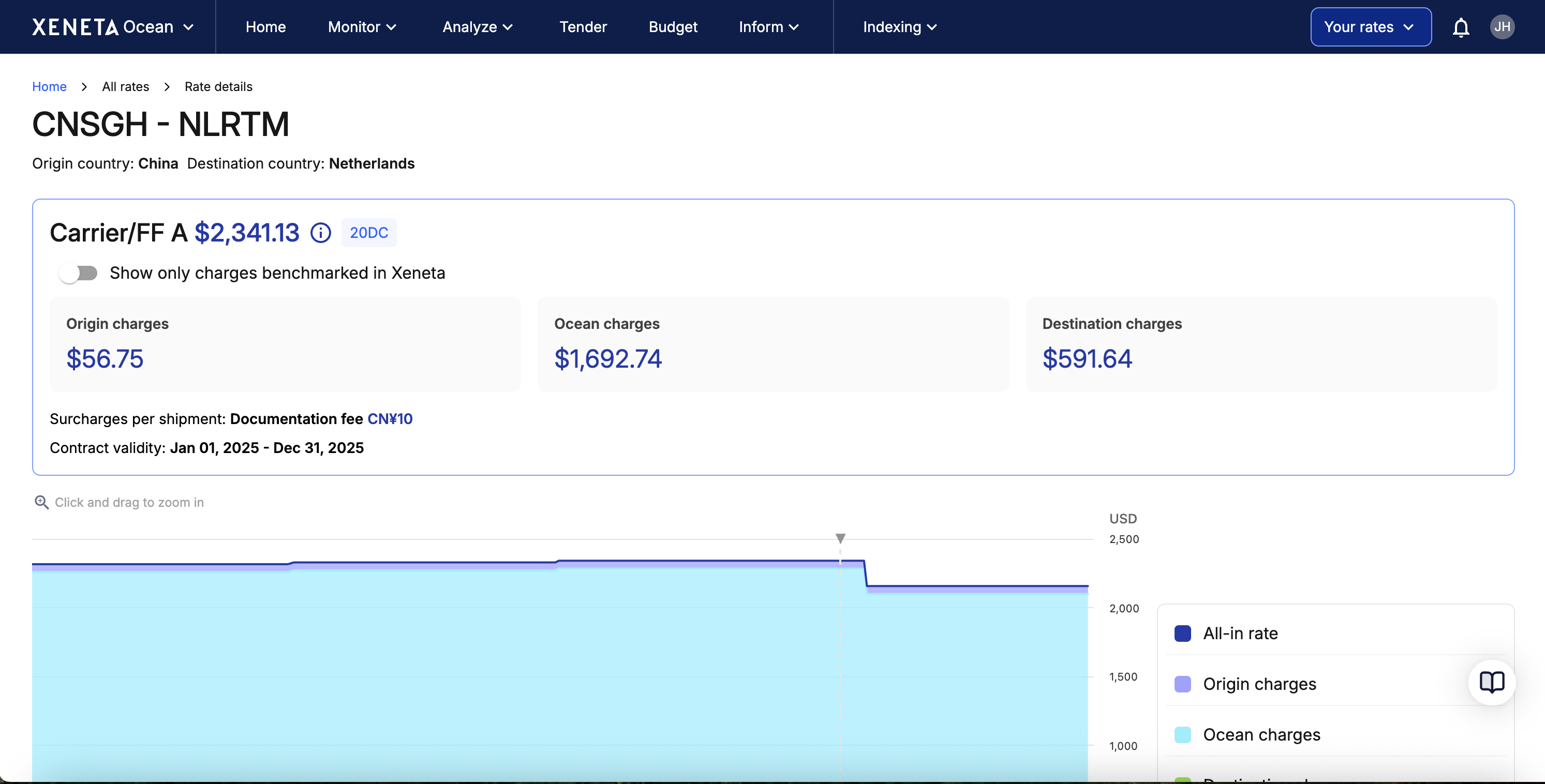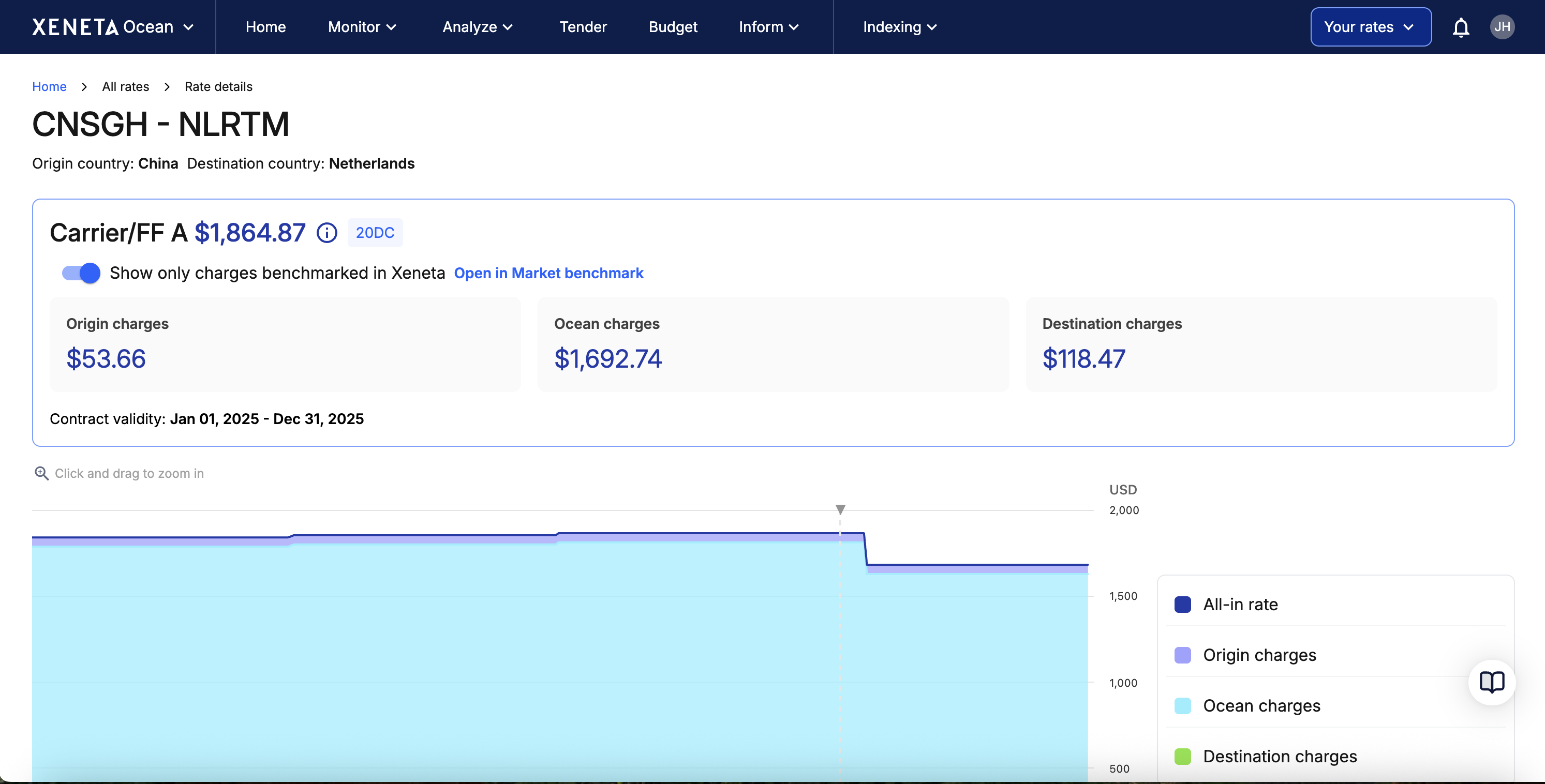 All charges are displayed, giving you a clear end-to-end view of your freight costs. If you prefer, you can use the toggle to show only Xeneta-benchmarked charges when you want to compare and benchmark your ocean freight rates.